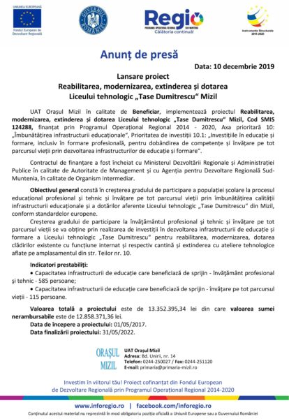 UAT Orașul Mizil în calitate de Beneficiar, implementează proiectul Reabilitarea, modernizarea, extinderea și dotarea Liceului tehnologic „Tase Dumitrescu“ Mizil, Cod SMIS 124288, finanțat prin Programul Operațional Regional 2014 – 2020, Axa prioritară 10: „Îmbunătățirea infrastructurii educaționale“, Prioritatea de investiții 10.1: „Investițiile în educație și formare, inclusiv în formare profesională, pentru dobândirea de competențe și învățare pe tot parcursul vieții prin dezvoltarea infrastructurilor de educație și formare“.