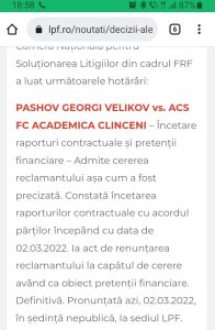 Din fericire pentru suporterii “lupilor”, în urma unor negocieri inițiate de președintele executriv al clubului găzarilor, Costel Lazăr, cel care a dat dovadă de dibăcie managerială, riscul prelungirii perioadei de stat pe tușă a lui Georgi Pashov a fost limitat până la zero. Astfel, conducătorii Academicii au acceptat verdictul de azi al CNSJ, din cadrul FRF (vezi facsimil). Moment din care, bulgarul poate fi legitimat la FC Petrolul și, implicit, dacă antrenorul principal Nicolae Constantin va avea nevoie sâmbătă, 5 martie, de serviciile sale în meciul cu FC Buzău, de astă-dată îl va putea și folosi. De subliniat că, la cameră, Pashov – ce-a renunțat patru salarii – a fost reprezentat de către noul său șef, Lazăr dând dovadă și de înclinații avocățești!