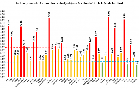 Coeficientul infectărilor cumulate la 14 zile, raportate la 1.000 de locuitori este calculat de către Direcțiile de Sănătate Publică, la nivelul Municipiului București și al județelor. Mai jos aveți graficul realizat în baza raportărilor primite de CNCCI de la Direcțiile de Sănătate Publică: