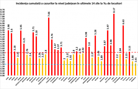 Coeficientul infectărilor cumulate la 14 zile, raportate la 1.000 de locuitori este calculat de către Direcțiile de Sănătate Publică, la nivelul Municipiului București și al județelor. Mai jos aveți graficul realizat în baza raportărilor primite de CNCCI de la Direcțiile de Sănătate Publică: