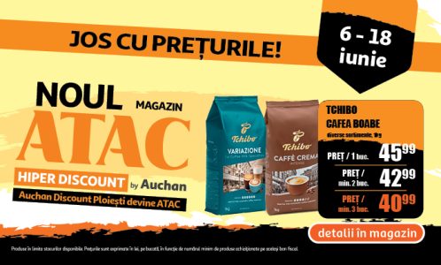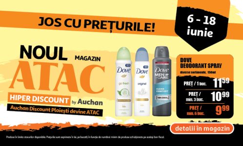 Începând de astăzi, 6 iunie, hipermarketul Auchan Discount Ploiești a devenit ATAC Hiper Discount by Auchan, unde găsești prețuri mici permanent și poți să faci economii importante zi de zi! Cu mesajul „Jos cu prețurile!”, ATAC propune prețuri mici la scară generalizată, precum și un sistem de prețuri cu reducere în cascadă, pentru cantități mai mari achiziționate. De asemenea, posesorii cardului de fidelitate MyCLUB Auchan au parte de oferte exclusive și prețuri speciale.