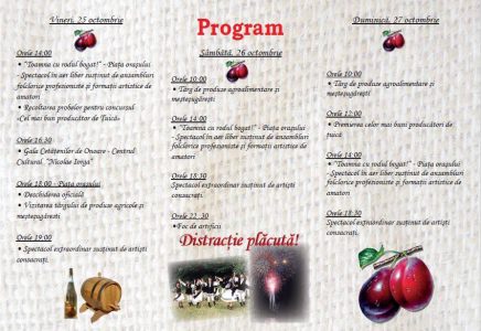 Pe parcursul celor trei zile vor fi organizate o serie de activităţi care au devenit de mult tradiţionale, activităţi ce vin sa bucure sufletele cetăţenilor oraşului şi ale invitaţilor lor. Este vorba de: FESTIVALUL ŢUICII – în cadrul căruia se organizează concursul de degustări unde sunt premiaţi producătorii de ţuică; SPECTACOLE ÎN AER LIBER susţinut de formaţiile artistice ale Centrului Cultural si din alte localităţi, dar şi artişti de primă mărime; TÂRGUL DE PRODUSE AGROALIMENTARE ŞI MEŞTEŞUGĂREŞTI şi alte momente surpriză.