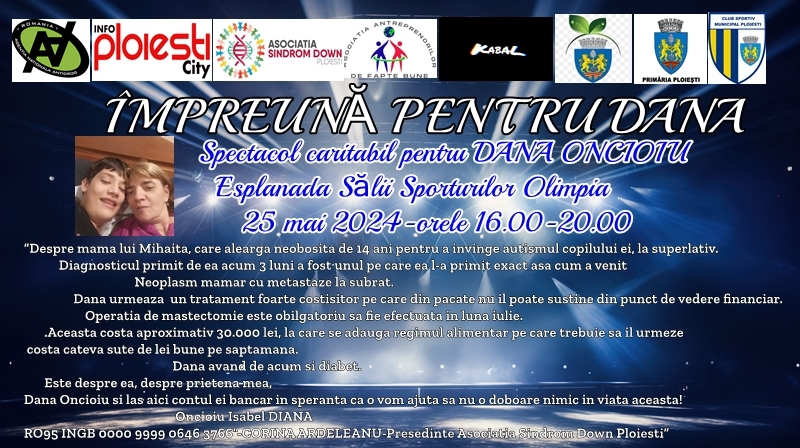 Sâmbătă, 25 mai a.c., între orele 16.00-20.00, pe esplanada Sălii Sporturilor „Olimpia„Ploiești, publicația on line INFO PLOIEȘTI respectiv ASOCIAȚIA SINDROM DOWN PLOIEȘTI în colaborare cu DJ KABAL (MARIAN COJOCARU) și ASOCIAȚIA ANTREPRENORILOR DE FAPTE BUNE , vor organiza SPECTACOLUL CARITABIL ”ÎMPREUNĂ PENTRU DANA„.