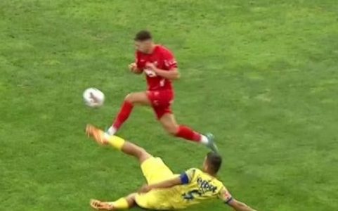 Să încep, practic, cu… începutul confruntării, deși, în fapt, trecuseră deja șase minute de la startul acesteia. În urma unei faze fixe, executată de către Țicu, Iancu cel mic din trupa Hermannstadtului, cel mare, vorba vine, intrând în repriza secundă, a țâșnit, în viteză, pe contraatac. Retras, căpitanul ploieștenilor s-a temut că îl va scăpa pe adversar și a făcut o alunecare (vezi fotografii din text), în urma căreia i-a lovit, din spate, cu piciorul său stâng, genunchiul stâng al mijlocașului. Un atac care a condus la oprirea din cursă a adversarului, e drept, dar și – din nefericire – la accidentarea foarte serioasă a acestuia. Inițial, s-a crezut că din cauza, hai să-i zic, piedicii puse la genunchi și a aterizării greșite, apoi, a lui Iancu s-ar fi produs accidentarea. Dar, nu a fost deloc așa, ci genunchiul drept al lui Vali alunecând pe iarbă i-a sucit glezna oponentului, prinzându-l cu aceasta pe gazon. Și astfel, după ce petrolistul s-a îndepărtat, l-am văzut pe sibian cu mâinile puse pe cap și nu am înțeles de ce.