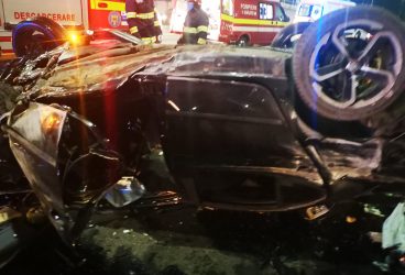 Imagini cu mașina răsturnată la giratoriul suspendat. Ocupanții au scăpat cu viață!