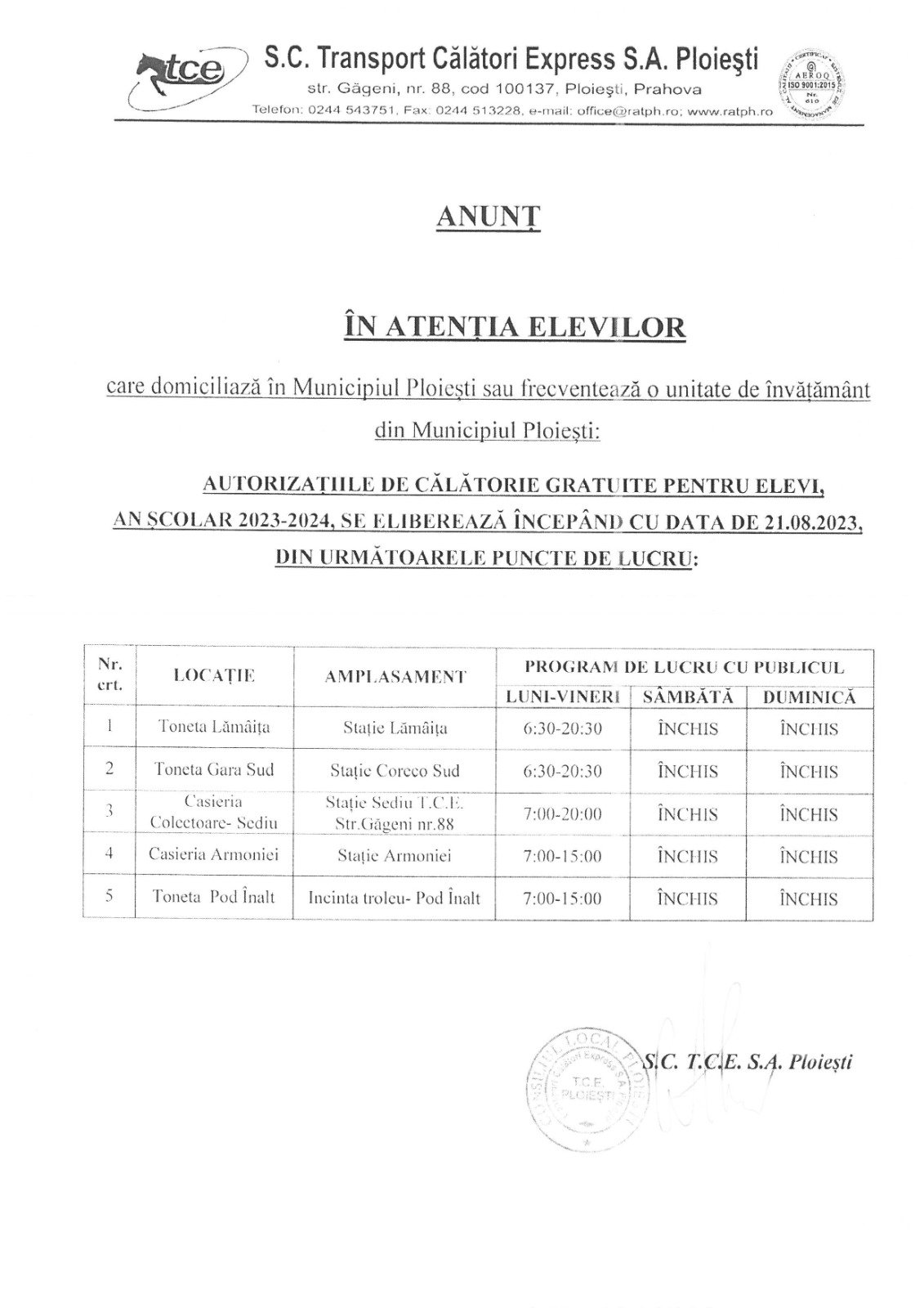 Anunț T.C.E. referitor la eliberarea, începând cu data de 21 august 2023, a autorizațiilor de călătorie gratuite pentru elevii care domiciliază în Ploiești sau frecventează o unitate de învățământ din municipiul Ploiesti, pentru anul școlar 2023 – 2024: