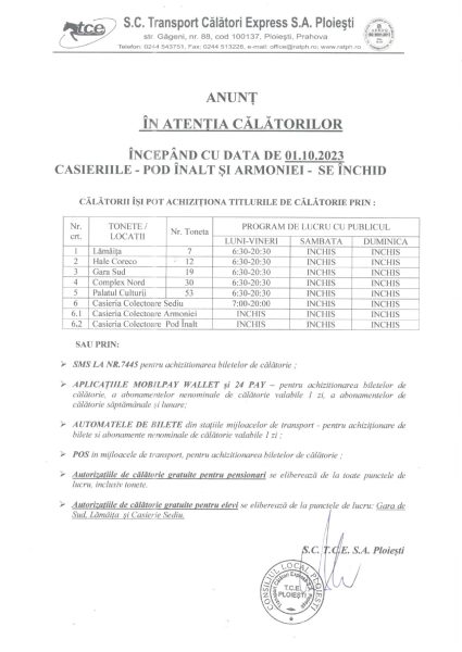 TCE Ploieşti anunţă că, de la data de 1 octombrie 2023, casieriile Podul Înalt şi Armoniei se închid. Iată anunţul companiei şi modalităţile prin care călătorii pot achiziţiona bilete: