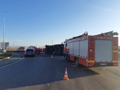 Accident în această dimineaţă, la intrarea în Ploieşti din DN1. În jurul orei 8.00, un autotren încărcat cu animale s-a răsturnat în giratoriul de la Carrefour, pe partea carosabilă.