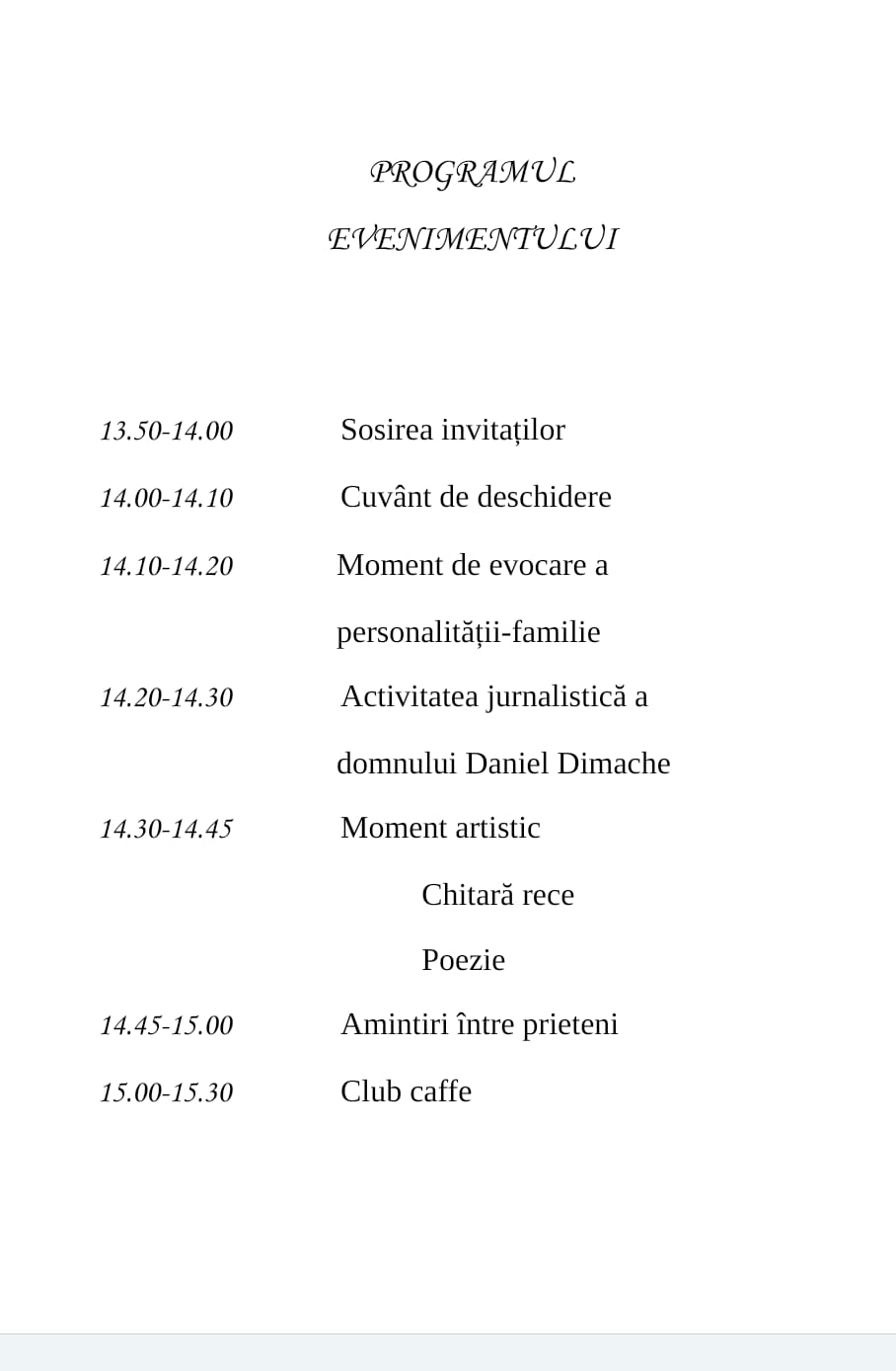 În luna martie 2025 se împlineşte un an de când cel care a fost jurnalistul Daniel Dimache a plecat dintre noi. În memoria celui care şi-a dedicat cariera acestei nobile meserii, în slujba cititorilor din Ploieşti, Prahova şi nu numai, la Biblioteca Judeţeană “Nicolae Iorga” Ploieşti se organizează, în data de 12 martie 2025, evenimentul cu numele: “Un an fără vocea şi condeiul domnului Daniel Dimache în comunitatea ploieşteană”.
