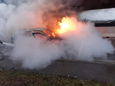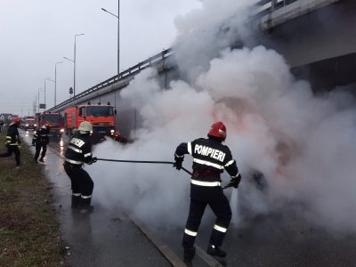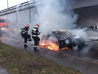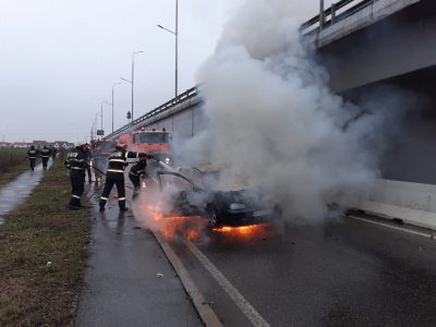 Șoferul a ieșit nevătămat, se pare, din autoturismul care era cuprins în totalitate de flăcări.
