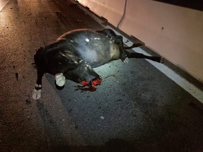 În momentul impactului animalul a fost proiectat pe cealaltă bandă a şoselei (de pe același sens de mers) unde a fost lovit de un alt autoturism.