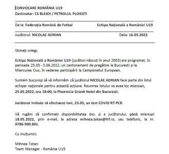 Mijlocașul Alin Boțogan, component al lotului echipei campioane a ediției 2021-2022 a Ligii a II-a, și portarul Mihai Berbeacă, împrumutat de FC Petrolul la CS Ocna Mureș, se află sub comanda selecționerului Daniel Oprescu, la echipa națională de juniori ‘U 18″, după cum am anunțat deja. Berbeacă este debutant sub tricolor. Tot un fotbalist împrumutat în Liga a III-a, de către clubul găzarilor, și tot la o echipă din play-out, ca și cea din Ocna Mureș, este și fundașul central Adrian Nicolae (foto). Acesta a combătut pentru prahovenii de la CS Blejoi, dar va rata ultimul meci oficial de acasă, cu Kids Tâmpa Brașov. Nicolae a fost convocat (vezi facsimil), prin intermediul fostului jurnalist Mihnea Totan Marsilian, acum team manager la lotul național de juniori “U 19”, de către selecționerul Adrian Văsâi. Reamintim că juniorii de la “U 18” parcurg un stagiu de pregătire în țară, pe care îl vor încheia cu un meci amical, în deplasare, cu echipa națională similară a Serbiei. În schimb, cei de la “U 19” nu vor avea parte de vreun joc amical, ci numai de antrenamente la București și Miercurea Ciuc.